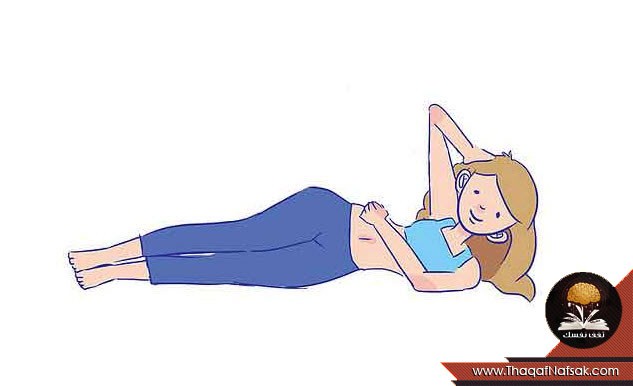 1- قم بالاستلقاء على الأرض على الجانب الأيمن على أن تبقى الرجلين مفرودة وقم بلف الذراع الأيمن حول الوسط بحيث تلمس راحة اليد اليمنى جانب الوسط الأيسر ثم تقوم بثنى الذراع الأيسر حول الرأس بحيث تكون راحة اليد اليسرى على آخر الرأس كما في الصورة