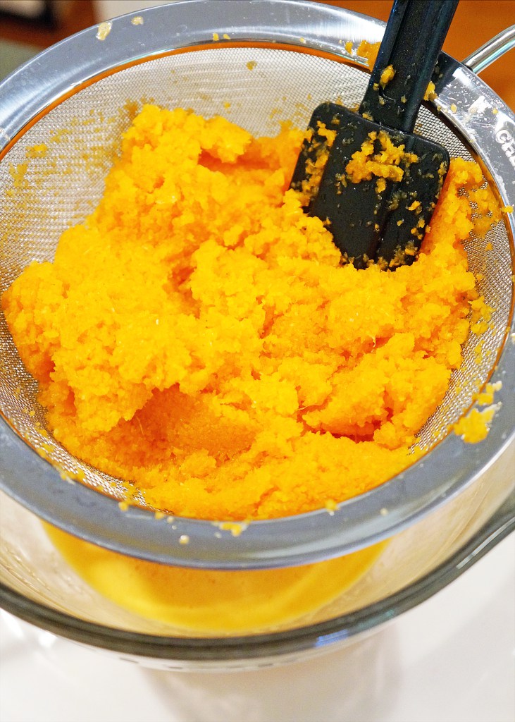 بعد الإنتهاء من سلق الجزر يتم وضع قطع البرتقال مع الجزر والزنجبيل في وعاء الخلط والعمل علي خلطهم معاً جيداً حتي يصبح الخليط ناعم وسلس .