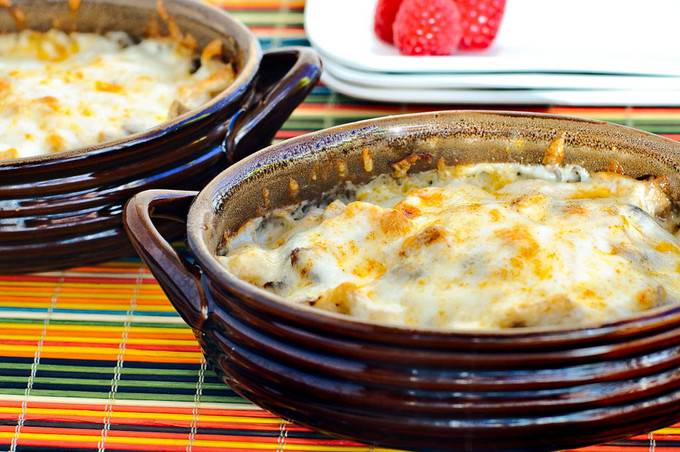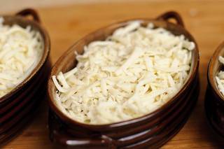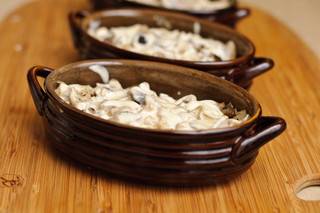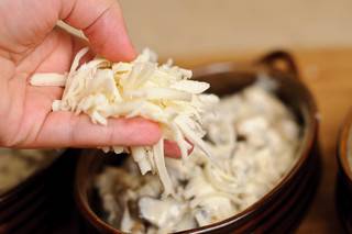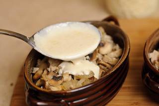 تجهيز طاجن ( وعاء ) مناسب لوضع الدجاج والمشروم مع صب الصوص فوق الخليط وتوزيع الجبن المبشور بالتساوي ورش القليل من الفلفل الحلو أعلي الطاجن .