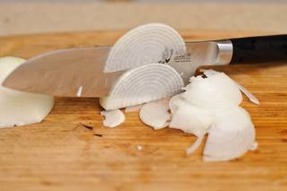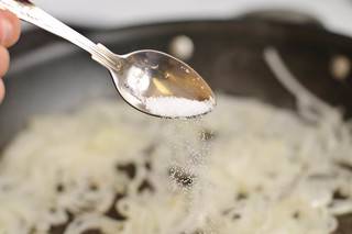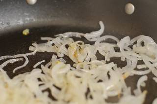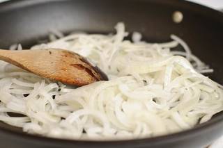 وضع 2 ملاعق كبيرة من الزيت النباتي في مقلاة كبيرة علي النار لتسخينه وبمجرد أن يتم تدفئة الزيت يتم إضافة البصل والتقليب عدة مرات مع إضاةفة الملح حتي يتحول لون البصل إلي اللون البني الذهبي قليلاً .