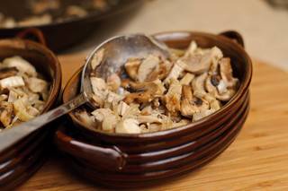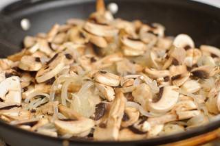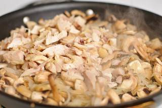 بعدها يتم إضافة قطع الفطر والدجاج إلي البصل المقلي و القلي لمدة 5 – 8 دقائق تقريباً مع إضافة 1/2 معلقة صغيرة من الفلفل الأسود المطحون ومزجه جيداً مع المكونات ثم إطفاء درجة الحرارة .