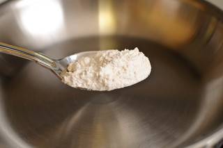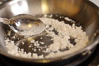 والأن قومي بتسخين مقلاة صغيرة من أجل تجفيف الدقيق وعمل الصوص، تأكدي من أن درجة الحرارة متوسطة وهادئة حتي لا يحترق الدقيق ثم إضافة 1 معلقة من الدقيق والتقليب بشدة .