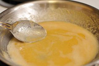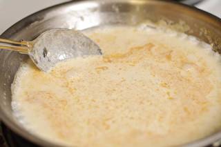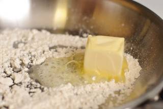 بمجرد أن يصبح لون الطحين أصفر تضاف الزبدة ويتم إذابتها مع الطحين بإستمرار عن طريق خلطها بإستمرار لتكوين الصوص . ضيفي الكريمة المخفوقة لزبدة الدقيق والتقليب حتي يتم دمجهم جيداً معاً . قد يستغرق ذلك أكثر من دقيقة واحدة وإذا كنت لا تريد أن يكون الصوص ثقيل يمكنك إضافة القليل من الحليب .